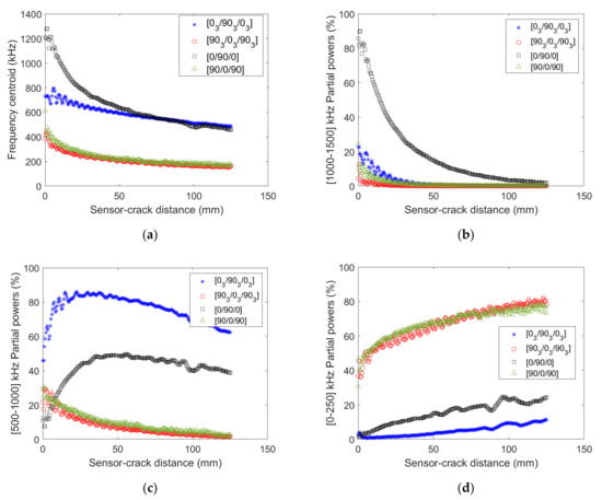 (a) Frequency centroid, (b) 1000–1500 kHz, (c) [500–1000] kHz and (d) 0–250 kHz partial powers as a function of distance between the source and the sensor obtained numerically for [0n/90 n/0 n] and [90n/0n/90n] stacking sequences (n = 1 or 3).