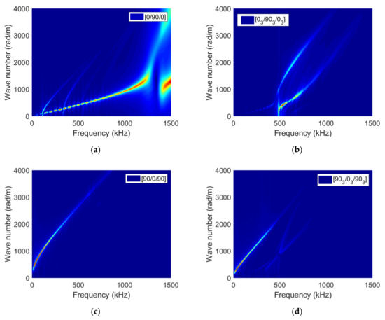 Simulated dispersion curves (wavenumber k as a function of frequency f) using 2D-FFT of signals recorded along a straight line perpendicular to the crack surface on the specimen top surface for (a) [0/90/0], (b) [03/903/03], (c) [90/0/90] and (d) [903/03/903] specimens.