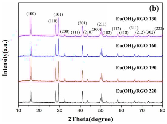 Figure 2b shows the XRD pattern of Eu(OH)3/RGO nanocomposites prepared at various temperatures. Due to the XRD pattern of RGO not being obvious, the XRD patterns of Eu(OH)3/RGO nanocomposites can be ascribed to pure hexagonal phase (space group P63/m) Eu(OH)3 ( JCPDS 83-2305: a = b = 6.35°A, c = 3.65°A ) []. The major peaks in the XRD patterns of the Eu(OH)3/RGO nanocomposites were observed at 2θ = 16.1°, 28.1°, 29.3°, 32.5°, 37.4°, 41.0°, 43.4°, 49.8°, 50.4°, 52.7°, and 58.2°, corresponding to the (100), (110), (101), (200), (111), (201),(210), (300), (211), (102), (112), (310), (311), (212), and (302) crystal planes, respectively []. In addition, the XRD patterns exhibited sharp reflections at small angles and wide reflections at high angles, indicating the layered structure of the nanocomposites []. Furthermore, no diffraction peaks corresponding to the presence of other impurities were detected. In addition, the typical diffraction peaks of RGO (002) were not observed, indicating that the crystal growth of Eu(OH)3 between the interlayer of the RGO sheet resulted in the exfoliation of RGO []. The results confirmed that the Eu(OH)3 nanoparticles were loaded on the surface of RGO, indicating the successful synthesis of the nanocomposites.