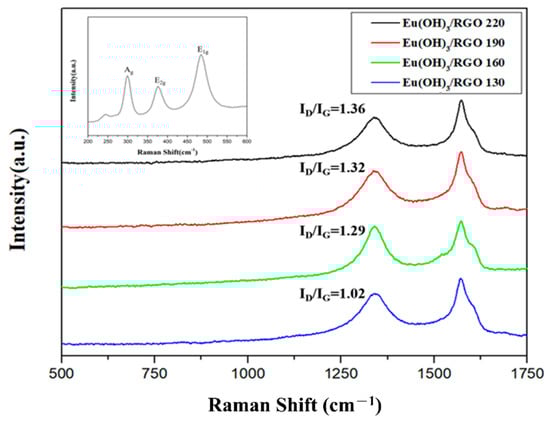 Raman spectroscopy is an important technique for characterizing carbon materials as it can closely examine the electron structure of carbon materials. Figure 3 shows the Raman spectra of the Eu(OH)3/RGO nanocomposites. Two major peaks corresponding to the D band and G band were observed at 1350 and 1580 cm−1, respectively. The D band corresponded to the local defects and disorder of the graphite layers, whereas the G band, which is related to the sp2 hybridized structure [], corresponded to the crystallizability and symmetry of the graphitic carbonaceous materials []. In addition, three Raman peaks were observed at 300.9, 376.1, and 485.4 cm−1 in the Raman spectra of Eu(OH)3 with a hexagonal crystal phase (P63/m), which could be attributed to Ag translatory, E2g translatory, and E1g libration modes, respectively (Figure 3) []. The vibrational mode representations were expressed as 4Ag + 3Bg + 2E1g + 5E2g +2Au + 4Bu + 4E1u + 2E2u, where 4Ag, 2E1g, and 5E2g were active Raman peaks [,]. The frequencies of these bands were consistent with the XRD results. Generally, the ID/IG value is used to determine the degree of order or disorder of carbon materials []. The composite degree increased with an increase in the ID/IG value. In this study, the ID/IG value increased gradually with an increase in the synthesis temperature of Eu(OH)3/RGO. The ID/IG values of the Eu(OH)3/RGO 130, Eu(OH)3/RGO 160, Eu(OH)3/RGO 190, and Eu(OH)3/RGO 220 nanocomposites were 1.02, 1.29, 1.32, and 1.36, respectively. The highest ID/IG value was observed at 220 °C, indicating that this is the optimum temperature for the synthesis of Eu(OH)3/RGO 220.