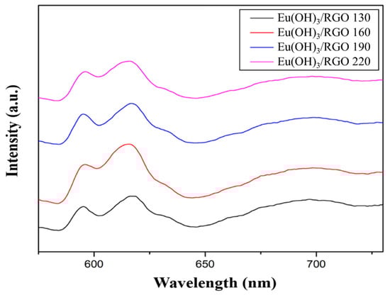 The emission spectra of Eu(OH)3/RGO nanocomposites synthesized at different temperatures obtained at a fixed excitation wavelength of 395 nm are shown in Figure 6. Despite the synthesis of the samples using a microwave-assisted method, the samples exhibited a relatively strong Eu3+ peak emission intensity, which could be attributed to its good morphology []. In addition, two peaks were detected in the fluorescence spectra of the samples between 580 and 730 nm, which were attributed to the 5D0 → 7FJ (J = 1, 2, 3, 4) transitions of the Eu (III). Furthermore, additional peaks were observed at 593, 617, 650, and 689 nm, which corresponded to J = 1, 2, 3, and 4, respectively []. In addition, the higher energy emissions of 5D1 and 5D2 in Eu(OH)3/RGO were quenched by nonradiative relaxation to 5D0 owing to the high energy OH phonons []. Furthermore, the emission spectrum of Eu3+ was very sensitive to the local symmetry of the crystal field. The peak at 593 nm corresponded to the magnetic dipole transition of 5D0 → 7F1, which had no significant effect on the symmetry of the crystal field. An additional peak corresponding to the electric dipole transition from 5D0 → 7F2 was observed at 617 nm, which could be attributed to the symmetrical torsion of Eu3+ in the crystal [].