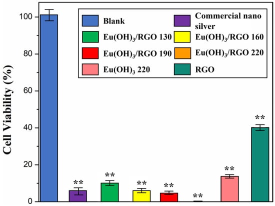 The antibacterial properties of Eu(OH)3/RGO nanocomposite were quantitatively evaluated using the colony-forming counting method. The MIC investigation revealed that the MIC of the Eu(OH)3/RGO nanocomposite was 8 µg/mL. Therefore, this concentration was used for the colony counting test. The number of bacteria colonies observed in the culture treated with Eu(OH)3/RGO nanocomposite was significantly smaller than that of blank colonies, indicating that Eu(OH)3/RGO nanocomposite inhibited bacterial growth and effectively killed bacteria (Figure 9). Furthermore, after 30 min of culture, the viability rate of E. coli in the commercial nano silver, Eu(OH)3/RGO 130, Eu(OH)3/RGO 160, Eu(OH)3/RGO 190, Eu(OH)3/RGO 220, Eu(OH)3 220, and RGO samples decreased to 7.0 ± 4.5%, 10.8 ± 3.1%, 7.2 ± 2.5%, 6.7 ± 2.0%, 0%, 17.3 ± 2.8%. and 40.0 ± 3.0% (n = 3, n = numbers of experimental results), respectively. The results indicated that there was a significant difference in all groups compared with the control group. In addition, the antimicrobial properties of the nanocomposites gradually increased with an increase in the synthesis temperature. This is because the particle size decreased and the crystal form became more compact with an increase in the synthesis temperature. Consequently, the small crystallite size and larger surface area of the nanocomposite significantly enhanced the chance of contact with bacteria. These results are consistent with the SEM and XRD results. Furthermore, the Eu(OH)3/RGO 190 and Eu(OH)3/RGO 220 nanocomposites reduced the viability of E.coli to levels below that of commercial nano silver (Figure 9). These results demonstrate the excellent antibacterial ability of the as-synthesized Eu(OH)3/RGO nanocomposites.