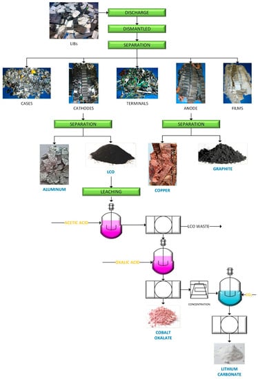 The hydrometallurgical process consists of acid leaching of the metallic content in the LIBs and their recovery through different pathways. This methodology offers advantages such as low energy consumption, minimum release of toxic gases, short reaction times, and recovery of high purity products [,].