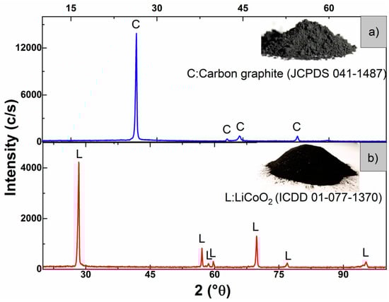 Results of the characterization of the active material of the (a) anode and (b) cathode, by XRD.