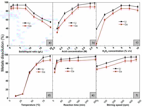 The effect of stirring speed on the cathode active material dissolution was investigated from 0 to 500 rpm. The experiments were performed using concentrations of HAc of 1.7 M, H2O2 6% v/v, 75 °C, 60 min, and an S/L ratio of 8 g/L. The results shown in Figure 4f indicate that a variation in the stirring speed between 0–500 rpm did not affect the extraction of the metals. This would indicate that the rate-determining step was the chemical reaction.