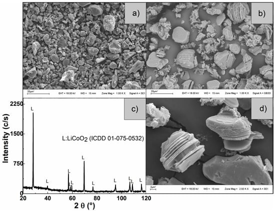 The micrographs of Figure 5b,d show a change in the morphology of the leaching residue with respect to the sample (Figure 5a). The particles of the residues obtained with HAc show attacked particles, but partially preserving their size and shape. Figure 5c shows the diffractogram of the residue where only diffraction lines corresponding to undissolved LiCoO2 (ICCD 01-075-0532) were detected, which enabled us to deduce that no crystalline solids were formed.