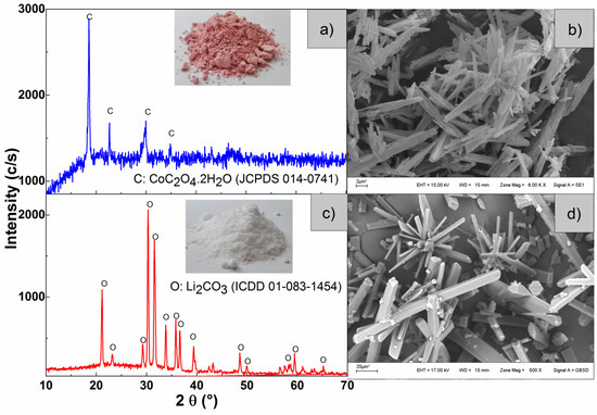 Diffractograms and micrographs of the synthesized solids. (a) XRD and (b) SEM of the cobalt oxalate, (c) XRD, and (d) SEM of the lithium carbonate.