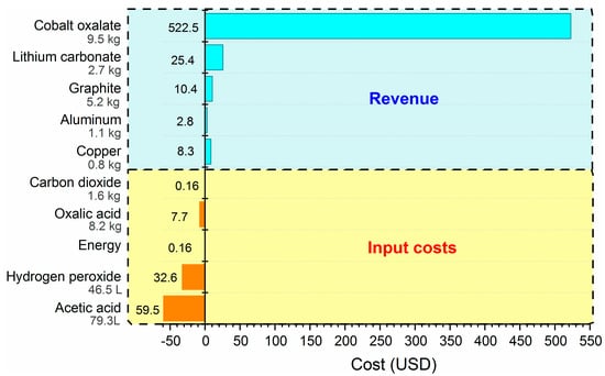 The preliminary economic analysis was carried out without considering the costs of collection, transportation, assembly, and operation of the plant. Here, only the manufacturing costs of the process were analyzed. It is important to note that the costs of the complete process varied considerably depending on the geographic location of a plant. That is why, in this work, only the manufacturing costs of the process proposed in Figure 1 were analyzed. In Figure 1, the incoming reagents of the system are shown in yellow and the compounds recovered from the LIBs are in blue. The prices of the chemical products used and obtained in the recycling process were obtained from the bibliography [,]. The electrical cost was taken as $0.09 per kWh [,]. The results in Figure 7 show the cost of the recycling process of 1000 cells of LIBs from mobile phones. In addition to the cost (input cost), calculating the cost of recycling LIBs also considered revenues, which were calculated as follows: