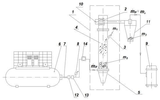 Scheme of experimental stand []. 1—turbo air classifier, 2—upper part of classifier chamber with a rotor, 3—feed inlet, 4—cylindrical part of classifier chamber, 5—conical part of classifier chamber, 6—piston compressor with expansion tank, 7—pressure reducing valve, 8—manometer, 9—vacuum cleaner, 10—electric motor, 11—cyclone, 12—air-oil separator, 13—compressed air dryer, 14—flowmeter, m1—feed mass, m2—coarse product mass, m3—fine product mass from the cyclone, m4—fine product mass from the filter, —air mass flux.