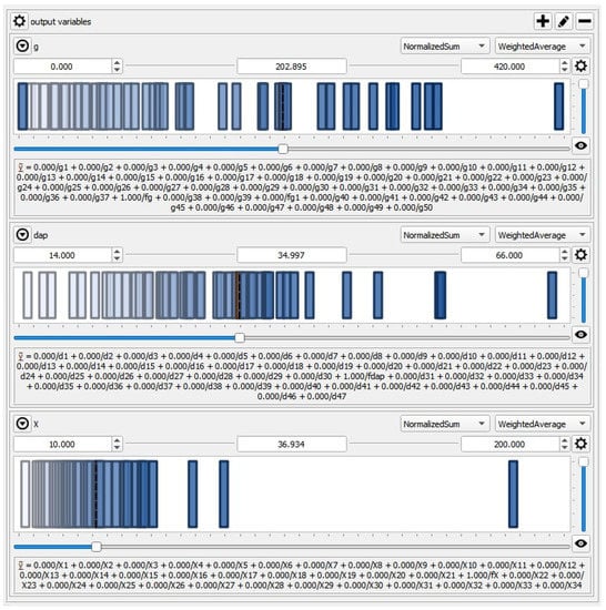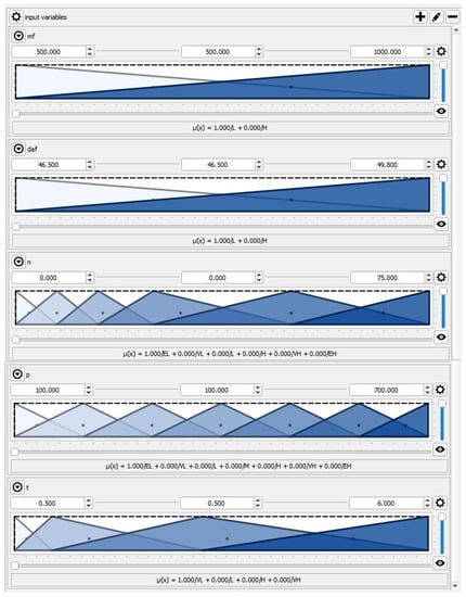 The QtFuzzyLite fuzzy logic control application, ver. 5.5.1, by the Qt Company Ltd., Wellington, New Zealand [] was used in the presented model research. The five input features were covered by triangular linguistic variables, according to Figure 3.