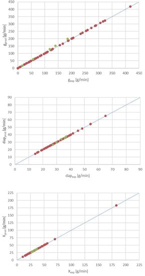 The FLClass system was successfully validated against the experimental results unseen by the model. These data were not previously used in the development process of the model. The maximum relative errors between the measured and calculated data for g, dap, and X are lower than 9% (Figure 5).