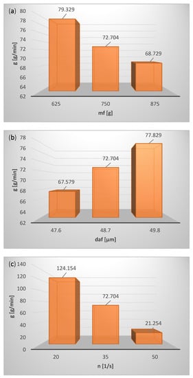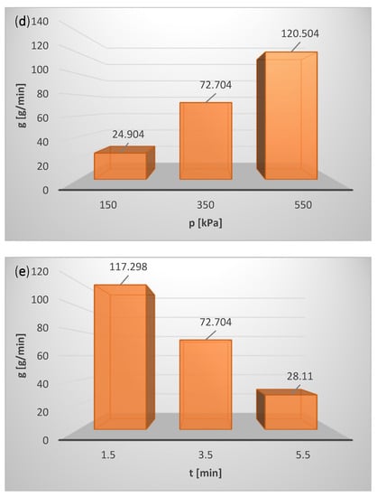 As we can see, the performance of the classification process can be enhanced by the decrease in mass of the fed material, classifier rotor speed, and shortening of the test duration time. The classification process can achieve further performance improvement by increasing the working air pressure and the Sauter mean diameter of the feed material. Therefore, for the considered range of input parameters, the highest performance g can be attained for the following conditions: mass of the fed material, mf = 500 g, Sauter mean diameter of the fed material daf = 49.8 µm, classifier rotor speed, n = 0, s−1, working air pressure p = 700 kPa and test conducting time, t = 0.5 min.