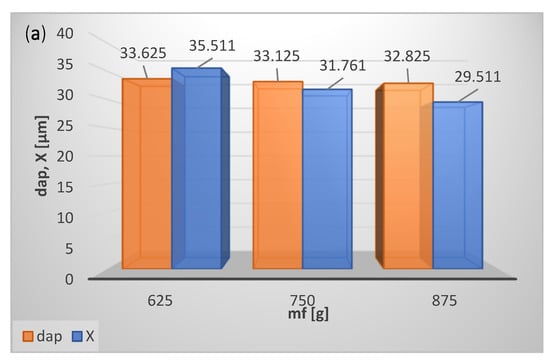 With the increase in the mass of the feed, mf, the material concentration in the classification zone rises, as a result of which classifier performance g decreases (Figure 6a), and cut size X as well as Sauter mean diameter dap of the classification product decrease (Figure 7a). A reduction of the classifier performance g with an increase in mf may result from the two-stage nature of the classification process, and it certainly requires further research.