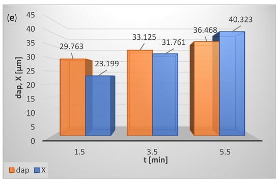 With the increase in time (with the passing of time), the particle concentration in the classification zone decreases, and classifier performance g declines (Figure 6e). In the initial phase of classification, first the fine particles are separated, which results in an increase in the average particle size of the material remaining in the fluidized bed; this material in the next phase of classification goes to the fine product (Sauter mean diameter of the product dap and cut size X increase) (Figure 7e).
