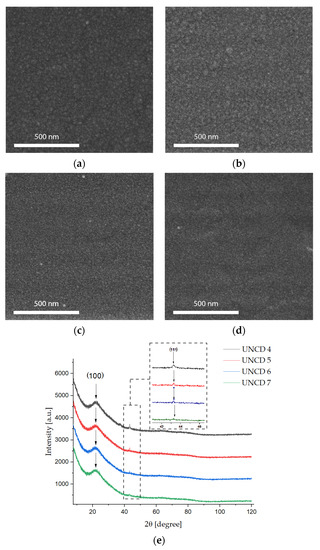 CVD diamond films, with the content of the vapours of methanol in quantities of (a) 4% (UNCD-4), (b) 5% (UNCD-5), (c) 6% (UNCD-6), and (d) 7% (UNCD-7), with (e) XRD peaks of diamond films.