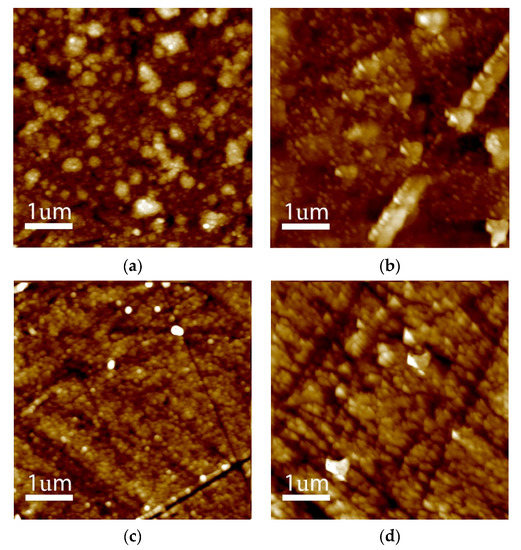 AFM 2D topography of (a) 4% (UNCD-4), (b) 5% (UNCD-5), (c) 6% (UNCD-6), and (d) 7% (UNCD-7).