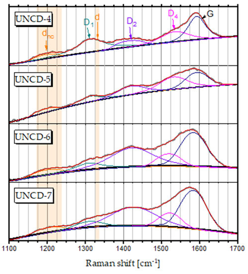 The dnc band was Raman inactive in the bulk diamond. However, the selection rules for Raman transitions were broken in UNCD due to the lack of translational symmetry of the crystalline lattice, which gave rise to the observed broad dnc component in the Raman spectra of the tetrahedral carbons [12,31].