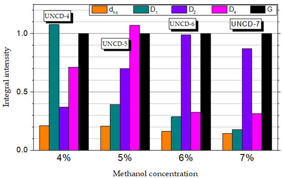 Figure 5 presents the development of individual peak intensities as a function of methanol concentration. We observed a slight decrease in intensity of the nanodiamond-related dnc component with the increasing of the methanol concentration. At the same time, a significant decrease in the intensity of the D1 line was clearly visible. Thus, we could conclude that the formation of UNCD clusters was coupled with C-H/sp3 defects. Higher concentrations of methanol in the methanol/H2 mixture were not conducive to the process of sp3 phase formation. On the other hand, higher methanol concentrations resulted in the C-OH/sp3 defects that were manifested by the broadening and higher integral intensity of the D2 component.