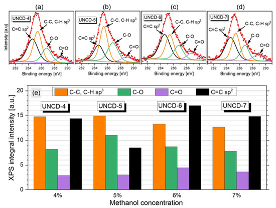 Figure 6a–d shows XPS spectra of the C 1s peak of the UNCD samples. The results of C 1s peak deconvolution with quantification of different carbon bonding states are compared in Figure 6e. By adjusting the energy allocations, then the Gaussian distribution, four types of bonds of the diamond layers could be distinguished: C=C sp2 bonding at 284.5 ± 0.1 eV, C-C, C-H sp3 bonding at 285.4 ± 0.1 eV, C-O bonding at 286.8 ± 0.1 eV, and C=O bonding at 288.9 ± 0.1 eV [34].