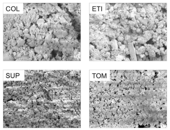 The SEM observations illustrated the presence of a large number of small spherical particles along with a small number of large polygonal particles in COL (fluoride+/abrasive+) and ETI (fluoride−/abrasive+), which contain only silica as abrasives. On the other hand, SUP (fluoride+/abrasive+) and TOM (fluoride−/abrasive+) contain heavy calcium carbonate and displayed numerous uniformly sized polygonal particles. Moreover, the abrasive densities of SUP and TOM were greater than those of COL and ETI (Figure 1).
