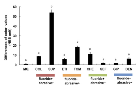 The color values were measured, and their variations with the control were calculated accordingly. The color differences between the SUP (fluoride+/abrasive+) and TOM (fluoride–/abrasive+) were significantly greater than those obtained after brushing with MQ and other toothpastes (p < 0.05). Specifically, brushing with SUP (fluoride+/abrasive+) caused the largest color variation among all the toothpastes (p < 0.01, Figure 3). However, all the toothpastes without abrasives did not vary in color differences from MQ.