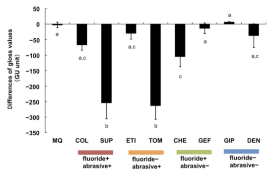 Influence of brushing with toothpastes or MQ on titanium gloss. The gloss values represent the variations with the values of the control sample. Independent experiments were repeated three times. Data represent the means ± SD of triplicate experiments. The different letters among the samples indicate a statistically significant difference (p < 0.01).
