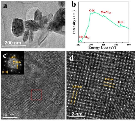 (a) TEM images of MoO3; (b) EELS of MoO3; (c,d) HRTEM images of MoO3.