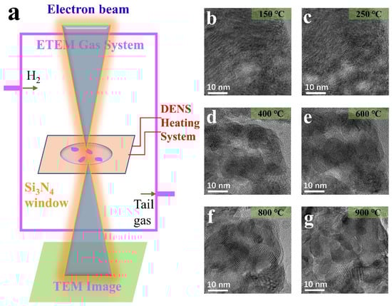 (a) Diagram of the experimental installation; (b–g) HRTEM images of the MoO3 NP by heating in H2 (0.6 mbar) at different temperatures.