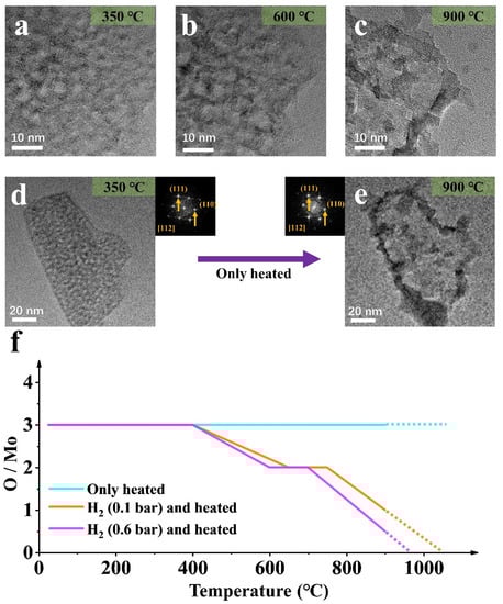 (a–e) TEM images of the MoO3 NP by only heating at different temperatures (in (d,e), the corresponding stable diffraction images and label are given respectively); (f) The element scale diagram changes of the NP in (a–e) at different temperatures.