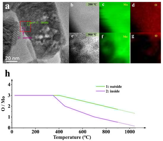 Figure 5 shows the structure, phase, and composition related to location evolution. Figure 5a is the TEM analysis of MoO3 NPs in the deoxidation process, and Figure 5b–g is the EELS mapping evolution in the red rectangular area at different temperatures. The EELS mapping gives a visual representation of the elemental processes, where the evolution of the oxygen content is evident, confirming the different oxidation states at different temperatures during the deoxygenation process. However, this process is accompanied by sublimation, as seen from the Mo region reduction, although the sublimation process under hydrogen is weak for pure heating (Figure 4).