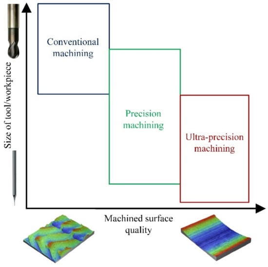 In recent years, the growing demand for the production of miniaturized parts with sizes ranging from several dozen micrometers to several millimeters has contributed to the increase in the popularity of so-called micro-machining. This technique mainly includes turning, drilling, and milling processes. It should be emphasized that micro-cutting processes can be implemented in the field of precision and ultra-precision machining (Figure 1).