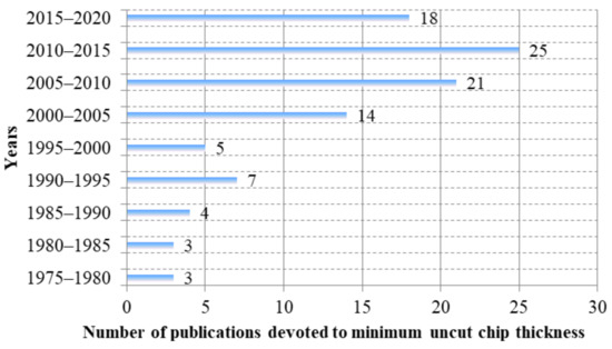Despite many experimental and theoretical studies on evaluation of minimum uncut chip thickness carried out in recent years (see Figure 2), a critical literature review has not yet been conducted. Therefore, the aim of this study was to carry out a comprehensive review of existing methods for the determination of minimum uncut chip thickness, particularly in precision, ultra-precision, and micro-machining processes. This work proposes a division of the minimum uncut chip thickness methods, as well as a discussion of the older (e.g., measurements of surface roughness, cutting forces, acoustic emission) and newer approaches (finite elements methods, molecular dynamics, smoothed particle hydrodynamics) applied for the evaluation of minimum uncut chip thickness.
