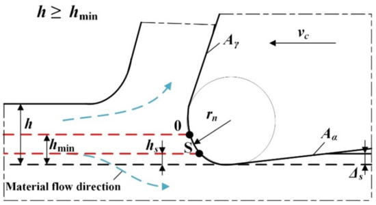 Due to the occurrence of elastic deformations of the workpiece and the non-zero radius of the main cutting edge rn, a certain volume of material flowing onto the cutting edge is not converted into a chip but is ploughed under the tool flank face Aα. It should be emphasized that this phenomenon becomes important, especially in the field of precision machining, carried out with small thicknesses of the cut. In the case when the uncut chip thickness is smaller than the hs value (denoting the thickness of the workpiece springback), the workpiece is only subjected to elastic deformation with a value of Δs and returns to the nominal position after the tool passes. Increasing the thickness of the uncut chip thickness to a value lower than hmin causes the formation of elastic–plastic and plastic deformations of the workpiece. The result is the formation of a plastic flash, which, however, is not transformed into a chip [20]. A further increase in the uncut chip thickness to the value within the range h ≥ hmin induces the cutting process and chip formation (Figure 3).