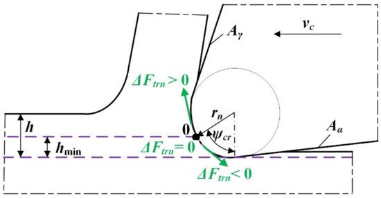 Storch and Zawada-Tomkiewicz [30] formulated an analytical hmin model for orthogonal turning. This model is based on the analysis of the tangential forces Ftrn acting on the rounded cutting edge. The developed force models were expressed as a linear function of the uncut chip thickness. The authors assumed that the increase in tangential forces at the stagnant point is zero (ΔFtrn = 0—Figure 5), which consequently made it possible to determine the stagnant angle ψcr on the basis of the following equation: