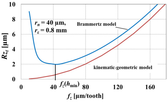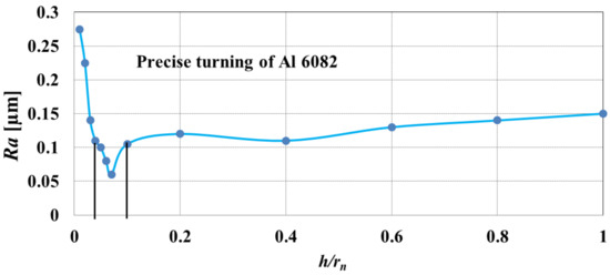 Considering the geometric dependencies in the workpiece–cutting edge interface, the minimum uncut chip thickness could be defined by the following relation: hmin = rn. Nevertheless, in practice, the real value of minimum uncut chip thickness is usually lower than the cutting edge radius. According to Kawalec [21], the minimum uncut chip thickness depends on the cutting edge, cutting parameters, and properties of the workpiece and tool material. The above dependence can be described by the following equation: