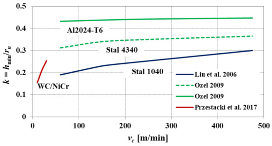 The normalized minimum uncut chip thickness k obtained during micro end milling of C45 steel with various cutting speeds vc. Elaborated on the basis of [35].