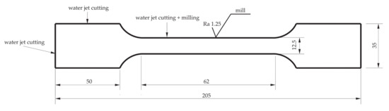 The dumbbell specimens (Figure 1) were made of 1.4541 steel (according to the designations EN 1.4541, PN 1H18N10T, AISI 321, X5CrNi18-10, SS 2337), whose percentage content of alloying elements was as follows: Ni 9.0–12.0; Cr 17.0–19.0; Mn < 2.0; C < 0.08; Si < 1.0; p < 0.045; S < 0.015; T < 0.70; and Fe = bal. Test specimens were cut by the Water jet method from a 2000 × 1000 × 5 mm3 metal sheet perpendicular to the rolling direction. The inner edges of the specimens were subjected to a milling process as shown in Figure 1.