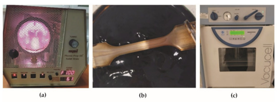 In the first step of graphene oxide deposition on BM + GO samples, surface activation and cleaning with RF (radio frequency) plasma was performed using a Plasma Prep III device (Garfield Ave, West Chester, PA, USA) (Figure 2a). The following parameters were used: 100 W for 30 min. The interaction of the plasma with the steel surface causes an increase in hydrophilicity [14,15] so that the aqueous suspension better wets the steel surface promoting the dissolution of graphene oxide flakes on the surface. This process, in addition to cleaning the surface, is aimed at the adhesive incorporation of graphene oxide particles into the surface layer of steel. Immediately after removal from the plasma chamber, the samples were placed in a Petri dish with a dispersed graphene oxide aqueous suspension for 10 min (Figure 2b). In the last step, the excess suspension was removed mechanically and the samples were placed in a vacuum dryer Vacucell 22 L (BMT Medical Technology s.r.o., Brno-Zábrdovice, Czech Republic) at 40 °C for 24 h (Figure 2c).