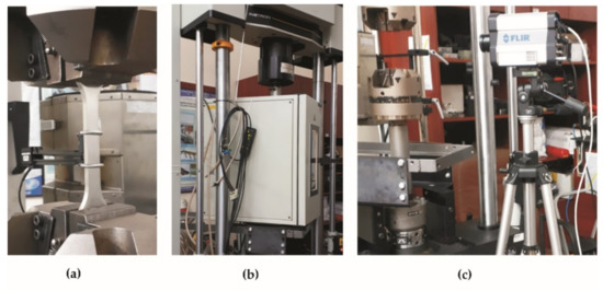 During static and fatigue measurements at 20 °C, the temperature distribution was performed using a FLIR (Teledyne FLIR, Wilsonville, OR, USA) model SC6000 thermal imaging camera (Figure 3c). The camera distance from the sample was approximately 0.6 m. The pictures were taken at full camera resolution of 640 × 320 pixels. The emissivity coefficients of the tested samples were determined by comparing the measurement of the average temperature on the surface of each sample measured by the thermal imaging camera with the actual value of the temperature set in the climatic chamber.