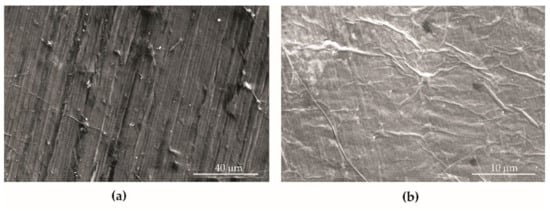 The analysis of the surface morphology of BM (Figure 4a) and BM + GO (Figure 4b) samples showed that graphene oxide flakes fill and smooth the structural notches, i.e., cracks formed during the sheet rolling process. As a result, a reduction in surface roughness after graphene oxide deposition of about 21.9% (Ra1) and 32.8% (Rz2) was observed (Table 2).