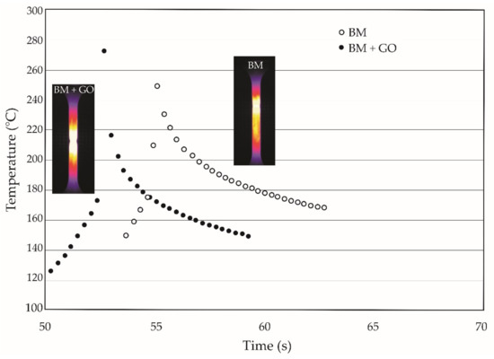 The maximum temperature during the static tensile test at the point of breakage was 9.4% lower for BM specimens as compared to BM + GO specimens. It was also observed that after tensile failure, the cooling process of BM + GO samples was faster (Figure 6). The recorded difference is probably due to the blocking of heat propagation by the graphene flake layer.