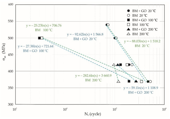 Wöhler plot of the limited range of BM and BM + GO samples at different temperature ranges of 20, 100, and 200 °C.