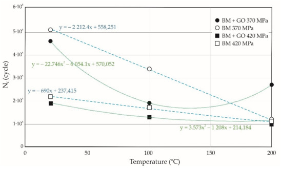 In Figure 8 the curves of fatigue life changes with respect to temperature at 20, 100, and 200 °C performed at a maximum stress level σmax of 370 and 420 MPa are presented. At 20 °C and 100 °C, an increase in the fatigue life of BM specimens compared to BM + GO was observed. However, at 200 °C the opposite situation was observed. There was an increase in the fatigue life of BM + GO samples compared to BM samples. In general, the study showed that as the temperature increases, the fatigue life of BM specimens decreases, in contrast to BM + GO specimens. This may be due to the change in the structural properties of graphene oxide flakes as a result of temperature changes and variable loads.