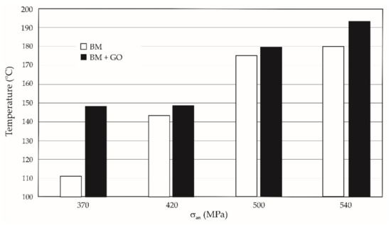 During the fatigue life tests, a higher temperature of 3–26% of the BM + GO specimens was also observed in comparison with BM specimens during final failure. The deposited graphene oxide layer provided an insulating layer, which made the sample heat up more slowly (Figure 9).