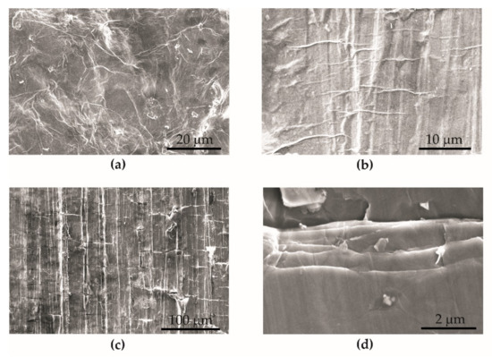 The deposited graphene oxide flakes formed a uniform surface on the BM + GO samples (Figure 11a). In the initial stage of fatigue cycling during the tests, extrusion-shaped lines arranged perpendicular to the force of the fatigue machine actuator and parallel to the fracture front were visualized on the surface of graphene flakes (Figure 11b). Then, as the number of cycles increased, parallel cracks of the deposited graphene oxide layer occurred at the extrusion sites (Figure 11c,d). This probably affects the performance properties (strength, durability, temperature changes) of the BM + GO samples.