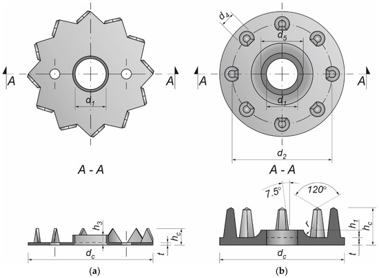 A toothed-plate connector (type C11-50/M12, Geka) is a single-sided connector made from a round plate with spikes on one side of the plate (see Figure 2b). The spikes are equidistant and are arranged in one circle. The toothed plate has a bolt-hole through its centre with a flange around the bolt-hole projecting from the same face as the spikes. The dimensions of the toothed plates used in this study are presented in Table 7. They were made of malleable cast iron EN-GJMB-350-10 (PN-JM 1130) according to EN 1562 [40] and galvanised (Fe/Zn12/C) to protect them from corrosion.