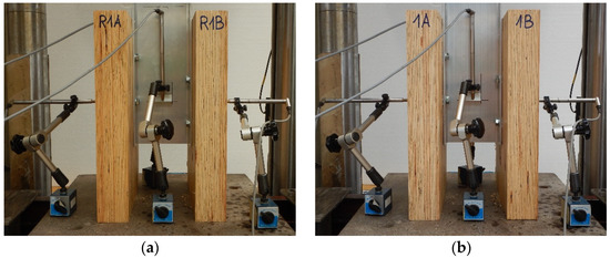 The location of the LVDTs on the specimen with reinforcing toothed plates: (a) screws 10 × 80 and toothed-plate connectors (type C2-50/M10G); (b) screws 12 × 80 and toothed-plate connectors (type C2-50/M12G, Bulldog).