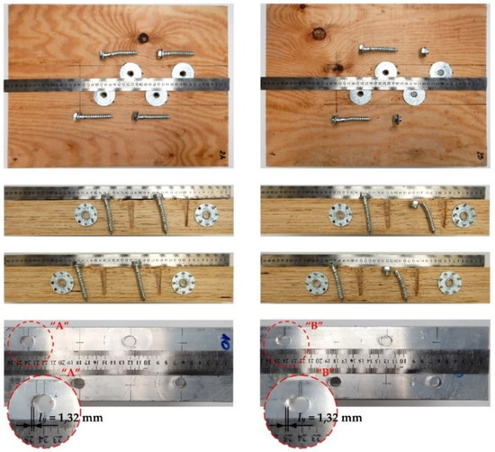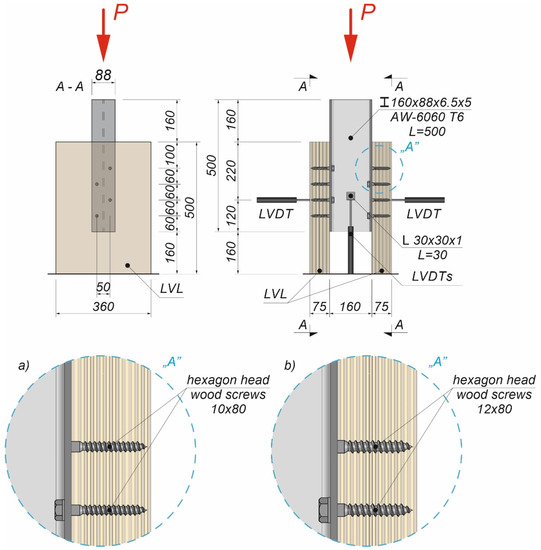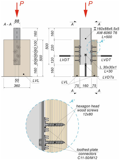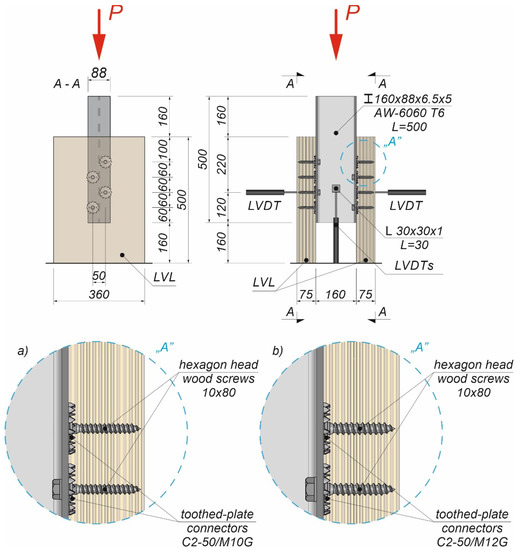 The holes in the aluminium beams had the same diameter as the screws to reduce the slip between the aluminium beams and the LVL slabs. The pre-drilling diameter in LVL was 7 mm for the 10 mm screw and 8 mm for the 12 mm screw. Pre-drilling started the course of the screw and created pilot holes. Furthermore, the installation of the hexagon head wood screws required less effort. In each specimen, screws were inserted in the face withdrawal direction using a torque wrench (Sandvik Belzer, IZO-I-100, 10–100 Nm). The tread-grain angle was 90°. The torque level was measured during the insertion of the screws using a torque wrench and recorded at the end of the insertion process (35 Nm for 10 mm screw, 50 Nm for 12 mm screw). The toothed plates were pressed into LVL using a hydraulic press and a compressive force equal to 35 kN. The spaces between the screws were 50 mm in the transverse direction and 60 mm in the longitudinal direction. The staggered spacing was used because of the dimensions of the toothed plates. The loading direction was parallel to the LVL grain. Linear variable differential transformers (LVDTs) were used to measure the longitudinal slip between the LVL slabs and the aluminium beam, and the horizontal move of the sample (see Figure 4, Figure 5 and Figure 6).