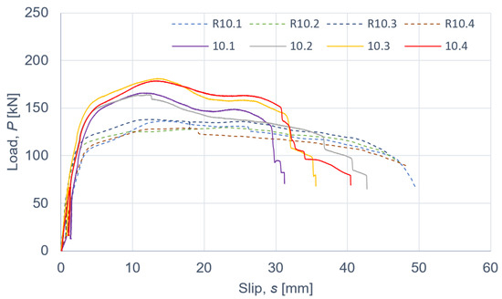 The load–slip curves from the push-out tests of the shear connections with 10 mm screws and with toothed-plate connectors (type C2-50/M10G, Bulldog) in specimens 10.1–10.4 or without toothed-plate connectors in specimens R10.1-R10.4.