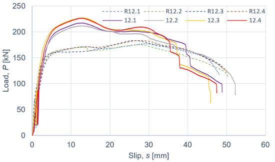The load–slip curves from the push-out tests of the shear connections with 12 mm screws and with toothed-plate connectors (type C2-50/M12G, Bulldog) in specimens 12.1–12.4 or without toothed-plate connectors in specimens R12.1-R12.4.